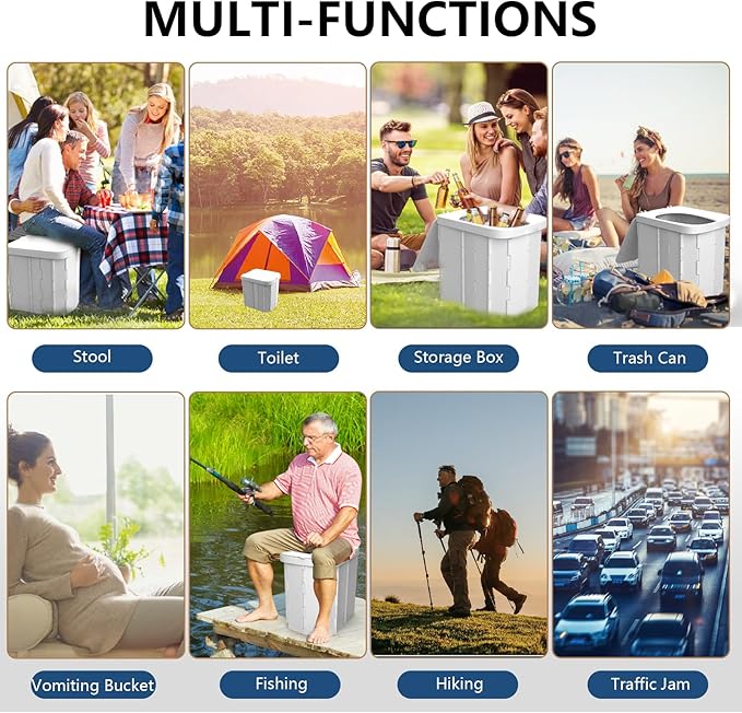 - 【Multifunctional and Widely Applicable】With lid, it can not only be used as an outdoor toilet, but also as indoor toilet for the elderly,a trash can, a storage box, a stool, a vomiting bucket, etc. to satisfy your different needs when taking outdoor activities. Perfect for backpacking, traveling, camping, boating, fishing, hiking, long road trip, and more.