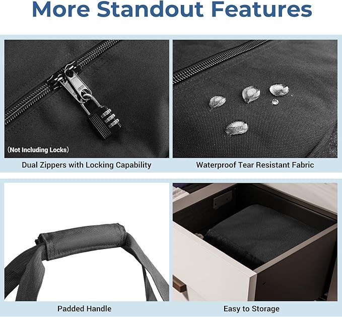 - Made of Sturdy, water-resistant 600 denier fabric material with premium heavy duty metal SBS 2-way lockable zippers(Not Including Locksï¼? The padded shoulder strap for total comfort, the sturdy polyester body makes this duffle bag ideal for long-term use