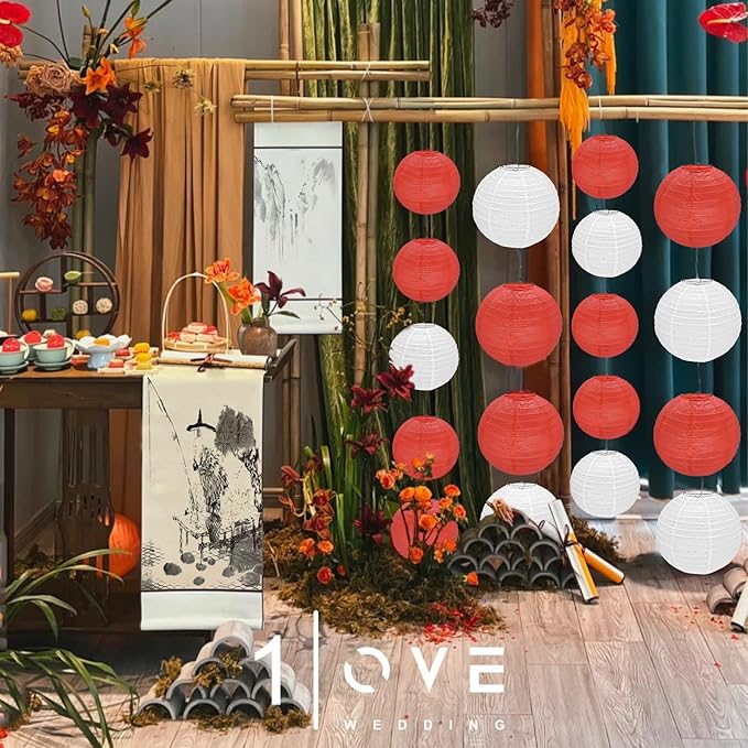 12Pcs Round Paper Lanterns Assorted Sizes (6" 8" 10" 12") for Home Decor, Restaurant, Church, Wedding, Birthday Party Decorations, Hanging Chinese Japanese Paper Lantern Lamps (White and Red)