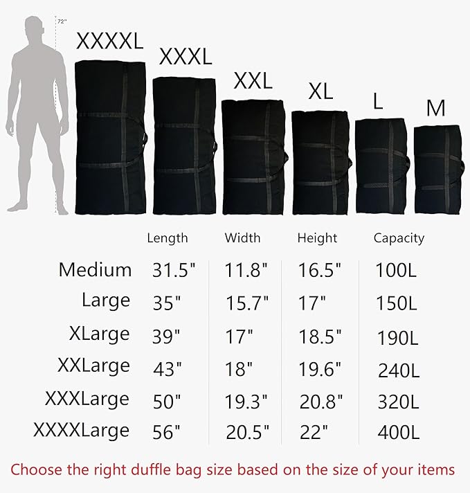 - MUST READ!!!!!!!!!: Please carefully check the human reference comparison chart and size comparison chart to choose the right size! If you store large items, we recommend that you choose XXXL and XXXXL. If you use it in daily life or travel, we strongly recommend that you choose medium, which has enough capacity to meet your needs.