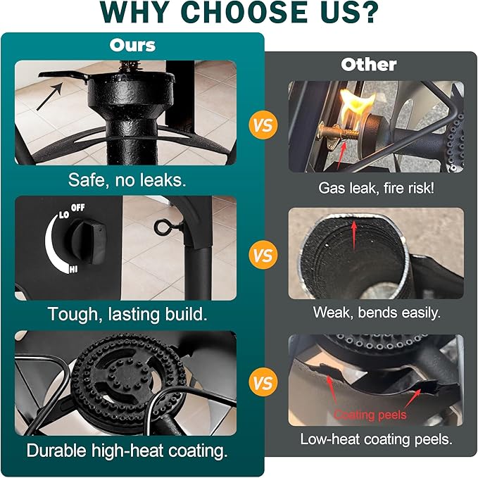 - ๐ฅ ๐๐๐ฟ๐ฎ๐ฏ๐น๐ฒ ๐๐ฎ๐๐ ๐๐ฟ๐ผ๐ป ๐๐๐ถ๐น๐ฑ: Made of strong cast iron with a heat-resistant coating for high temperatures. High-quality cast iron burner heads resist oxidation and water drips, supporting up to 100 pounds, unlike some products with paint that may peel.