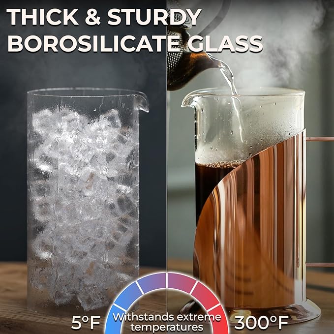 - Durable and Stylish Design: Constructed with borosilicate glass and stainless steel, this French press features a robust handle for durability and a sleek look, making it a stylish addition to your kitchen