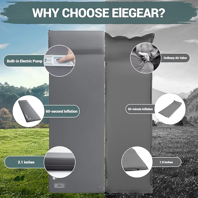 - Built-in Electric Pump for Effortless Storage: Elegear foam sleeping pad comes with a built-in electric pump, realizing one-touch inflation and deflation, vacuum compression storage can greatly save storage space. With our camping sleeping pads, you'll say goodbye to the laborious inflating and storage, getting the best camping experience. NOTE: The endurance of the pump is 20 mins, and it takes 1 min to inflate and 2 min to deflate, please keep an eye on the power level when using it.