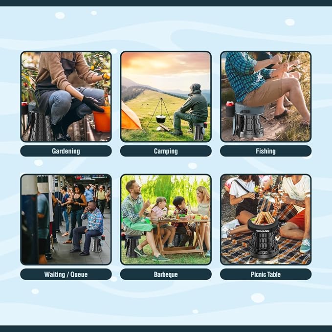 - 🔥【ENDLESS OPTIONS】The NUMANU Portable Telescopic Seat, Collapsible Stool is used by many for Camping, Hiking, Waiting in Line, Gift, Live Concert Events, Plumbing, Construction, DIY/Fixing, Fishing, Gardening, Resting, Travel, Commuting, Bus, Train, Subway and More. Take your retractable folding stool along with you!