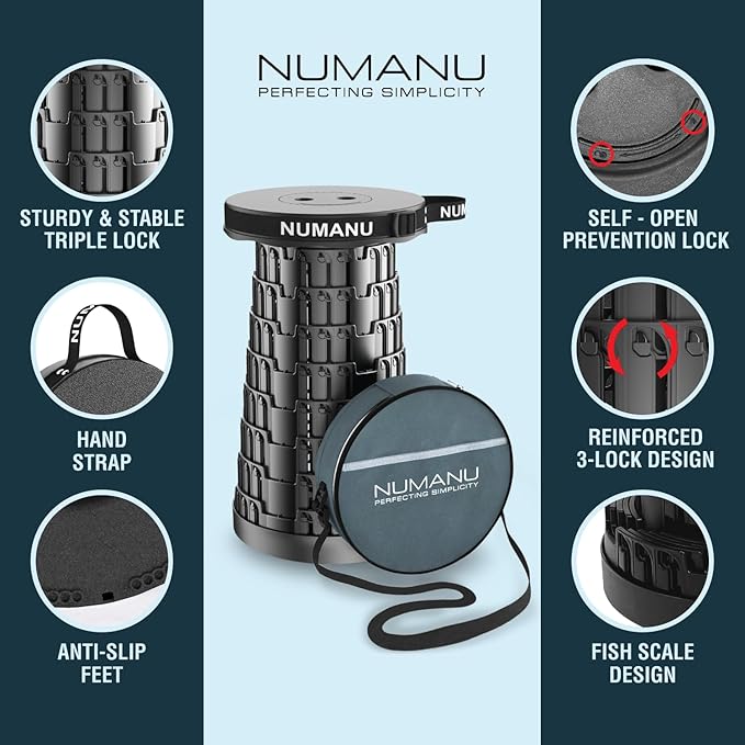 - 🔒【SELF-OPEN PREVENTION LOCK】Most Telescoping Stools do not properly lock and slip out unexpectedly while Collapsed / Closed. NUMANU's Telescopic Foldable Retractable Seat is always securely locked in place with our open-prevention Safety Lock.