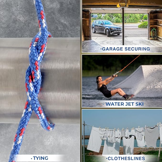 - Dimensions & Vibrant Color Options: Measures 5/16" in diameter and 50 feet in length, with a striking blue, white, and red pattern for enhanced visibility and aesthetic appeal.