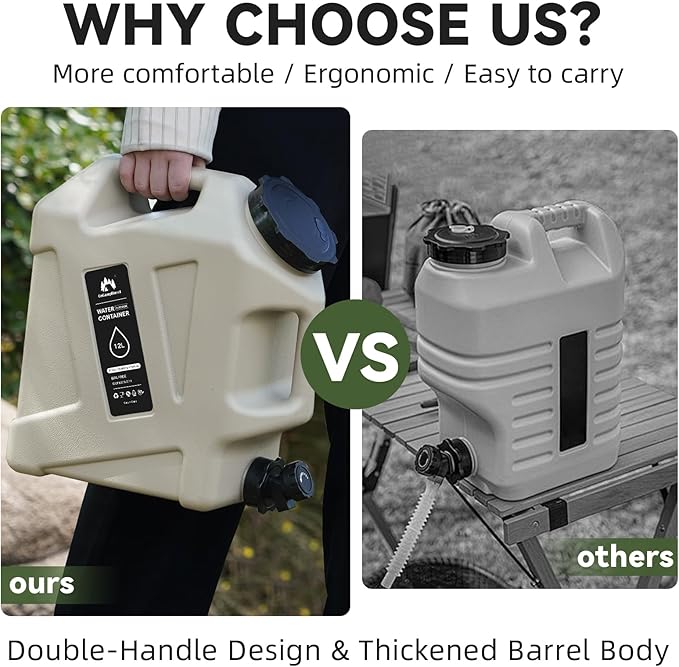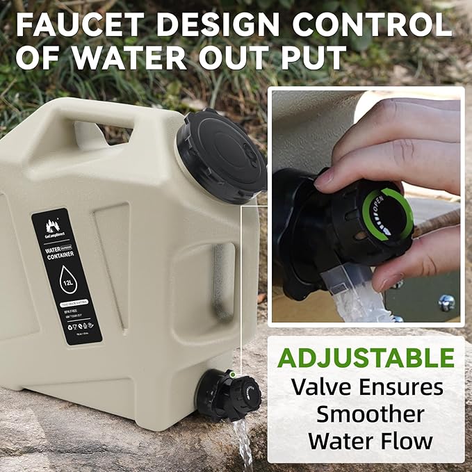 - 【LEAK-PROOF Lid & Water Spigot】Our Camping Water Storage has has a sealing cover and leak-proof faucet that ensures safe storage and easy transportation, without worrying about leaks or spills while in use. It a unique faucet design and 2 extension spigot. Compared to other containers, you don't have to struggle to unscrew the lid, you can dispense water with a simple knob and control the water volume. The extension pipe can be stored in the grooves of the barrel body making storage more convenient.
