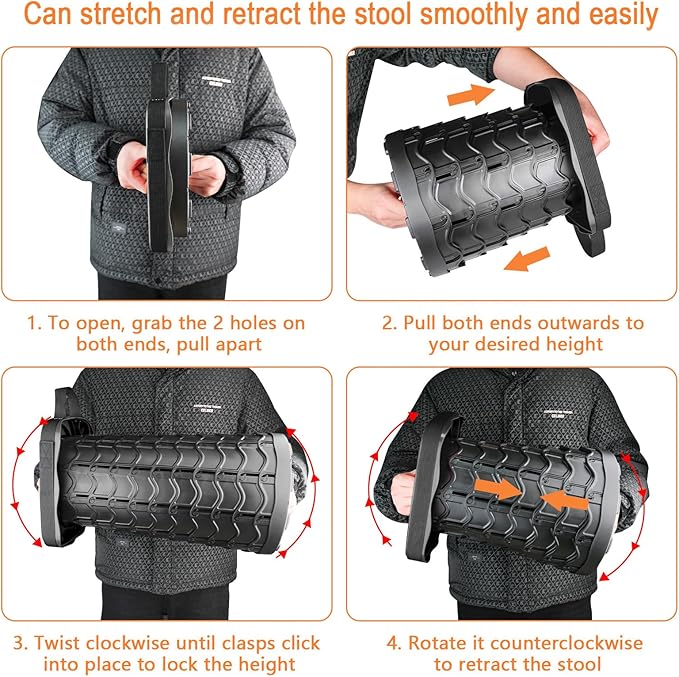 - STRETCH AND RETRACT SMOOTHLY AND EASILY: Benefiting from the fish scale design and our high precision production equipment, scales interlamellar spacing is kept 0.1mm. Make sure the stool’s stretch and retract smoothly and easily. You can open and close the stool in just seconds.