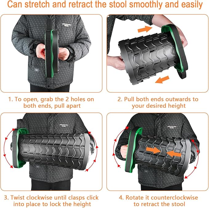 - STRETCH AND RETRACT SMOOTHLY AND EASILY: Benefiting from the fish scale design and our high precision production equipment, scales interlamellar spacing is kept 0.1mm. Make sure the stool’s stretch and retract smoothly and easily. You can open and close the stool in just seconds.
