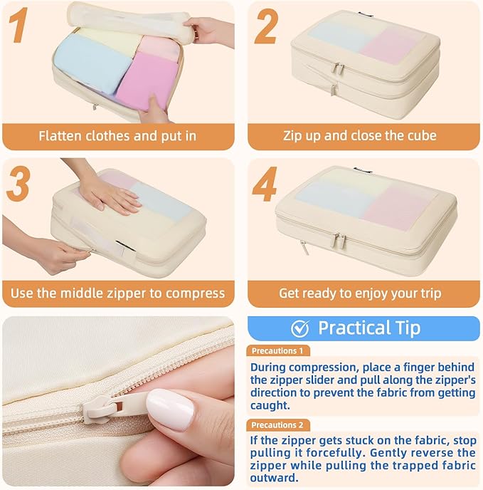 - HOW TO MAKE THE COMPRESSION HAPPEN? - There Is a Extra Zipper Outside Of Our Compression Packing Cubes Which Can Be Zipped Up To Flatten The Cubes And Save The Space As Far As Possible. It Just Works Like a Vacuum Sealer. You Just Need To :1) Fold Your Clothes And Flatten Them 2)Pack Clothes In The Cubes And Zip The Normal Zipper. 3)Put A Finger On The Back Of The Zipper In The Space When Compressing The Packing Cubes In Case The Zipper Get Stuck In Fabric.