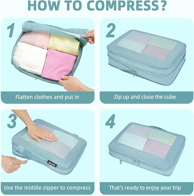 - EASY TO TRIP: Using The Compression Packing Cubes, not only Can Utilize the Limited Space in Suitcase to Accommodate More Essentials, but also can Categorize And Organize Your Items so That You Can Find What You Want Whenever You Need It.