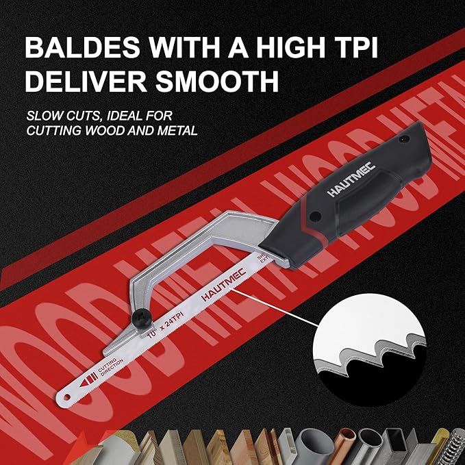 - 【Fits 10" & 12" Blades】Compatible with standard 10" and 12" hacksaw blades, includes 1pc 10” 24TPI bi-metal HSS blade for multi-purpose cutting