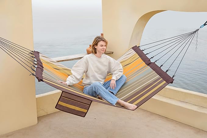 - ✅DOUBLE HAMMOCK & SPACIOUS ENOUGH TO SHARE: The comfort that comes with extra space is vital to us, and its size also boasts a wider range of versatility, allowing it to be hung from a 12-14ft hammock stand (not included) or used outdoors on its own.The hammock bed's dimension is 77" L * 57" W, the length from chain to chain is 14', larger than other quilted hammocks.