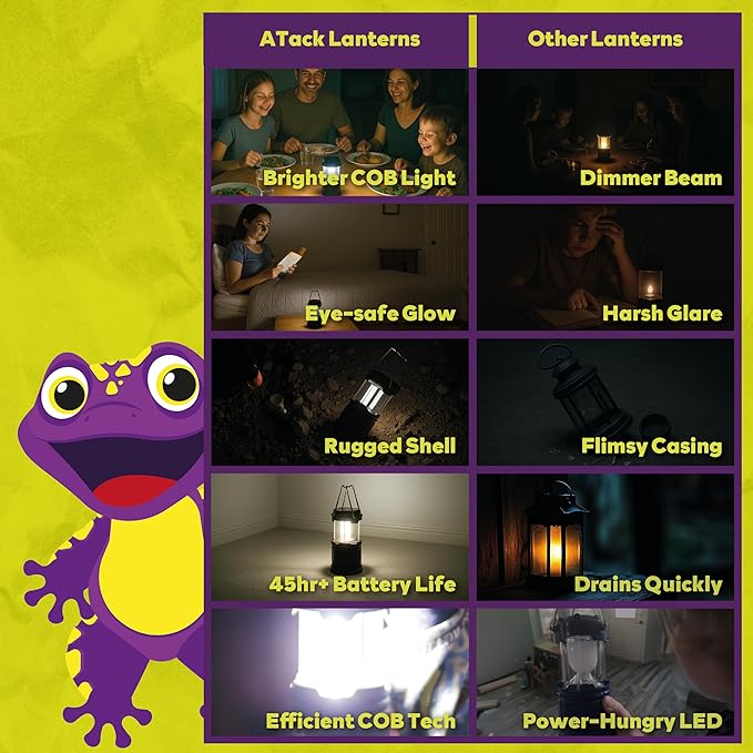 - Stable hanging design. Featuring foldable hooks, this battery operated camping lantern hangs upright on tents, branches, or backpacks, making it the perfect camp light and battery operated lanterns for power outages alike.