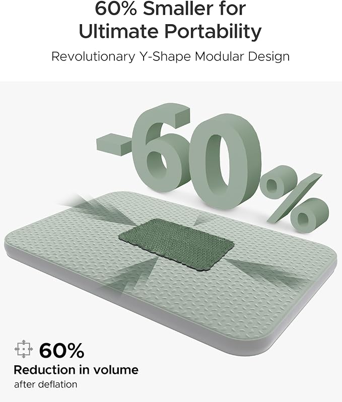 - πππ¦π¬-π§π’-π£πππ, π¨ππ§π₯π-π£π’π₯π§ππππ πππ¦?ππ‘: The Y-shaped telescopic foam structure compresses the padβs volume by up to 60% after deflationβmaking it lighter and more compact than traditional foam air mattresses. As it deflates, a built-in crease line naturally forms down the center, making it easier to roll and pack in seconds