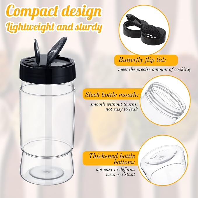 - Sufficient Quantity and Large Capacity: there are 30 pieces plastic spice jars with shaker in the package, and the black screw lid with double sided flip lid can meet the storage needs of various spices in daily life; The spice jar has a capacity of 10.1 oz/ 300 ml, providing a larger capacity for storing spices