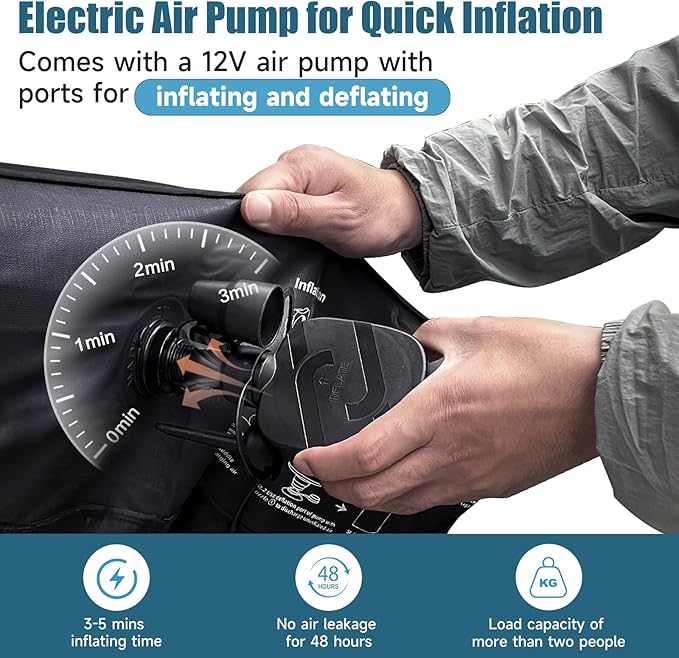 - FAST INFLATION AND DEFLATION: Equipped with car power fast charging electric pump for air mattress, quickly inflate or deflate through different ports, 12 volt DC power plug,Used to connect car power socket,Open exhaust valve,Press and discharge air,Double-layer air nozzle,let The air can only enter,And it can be inflated quickly and easily
