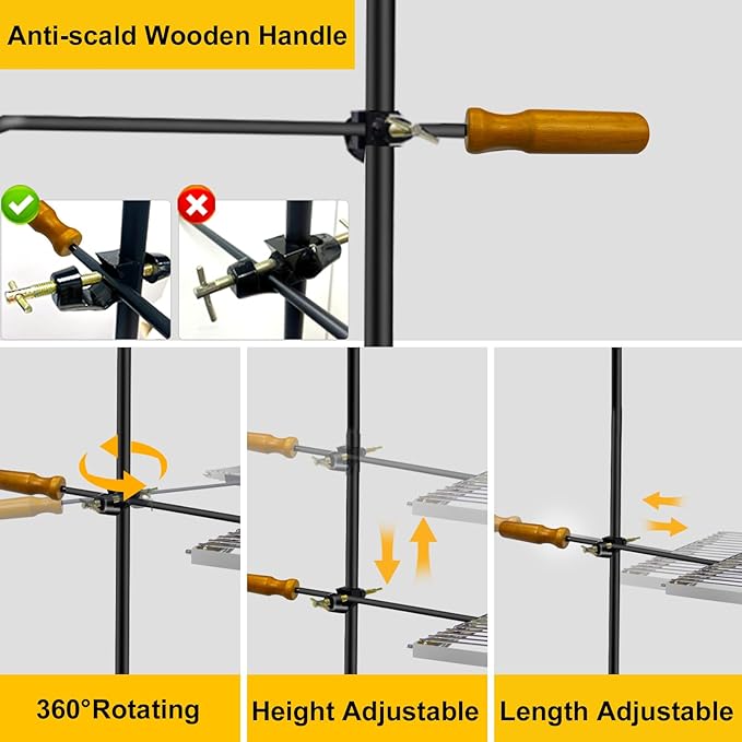 - 【Omni-Adjustment】Rotating the cross clips and adjusting the height of two rods to control the cooking temperature. You can also adjust the length of the 2 rods to fit the distance of the fire pit for optimal grilling over an open flame. The wooden handle can prevent hot hands.