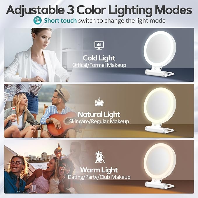 - 【 Adjustable Stand & 3 Colors】Features a flexible foldaway handle. The desk mirror with light can be hung on the wall or stand on any flat surface by adjusting the handle, and can be used as a hand mirror, tabletop mirror, and hanging mirror. 3 kinds of lights: warm light, white light, daylight, and bright light without glare, can protect your eyes. You can choose different light colors according to your needs
