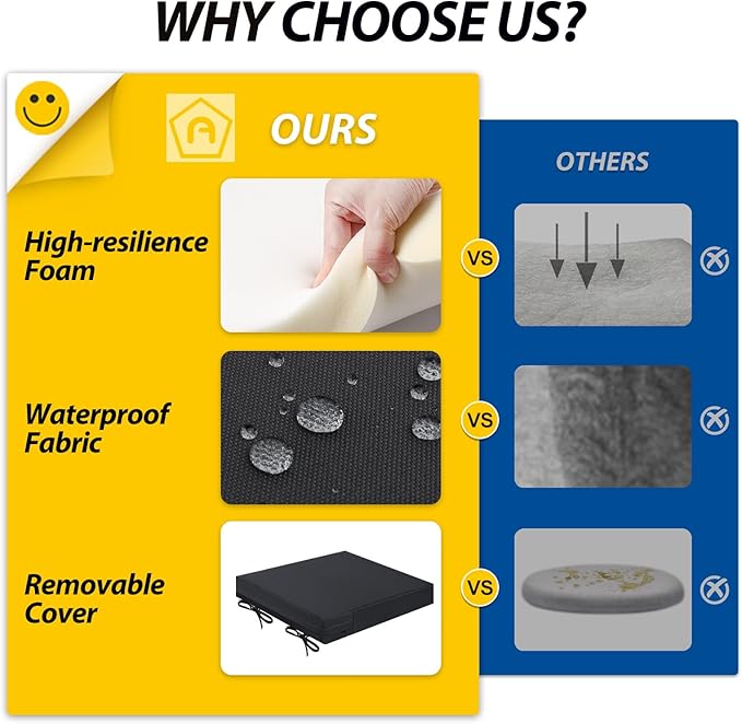 - Wide Use & Tips: These outdoor dining chair cushions fit pools, patios, balconies, decks, backyards, and gazebos. Foam inserts and covers are packed separately in bags and placed in one box—check all parts. Easy assembly required