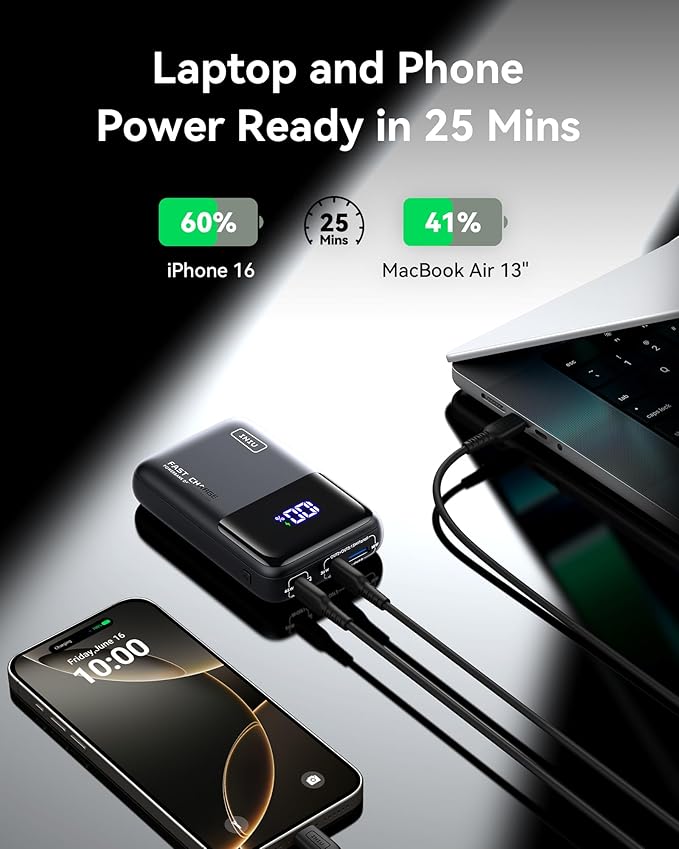 - Power Ready iPhone & MacBook in 25Mins: A must-have for multi-device users, this power bank provides up to 65W high-speed charging for two devices simultaneously. In just 25 minutes, it can charge your MacBook Air 13" to 41% and iPhone 15 to 56%. It also supports Samsung Super Fast Charging 2.2.