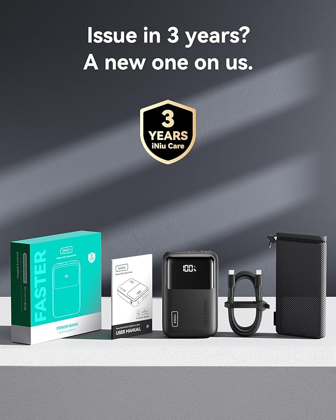 - What You Get: INIU 20000mAh power bank*1, 100W USB-C to USB-C Cable 1ft*1, welcome guide*1, industry-leading 5-Year iNiu Care, plus lifetime technical support.