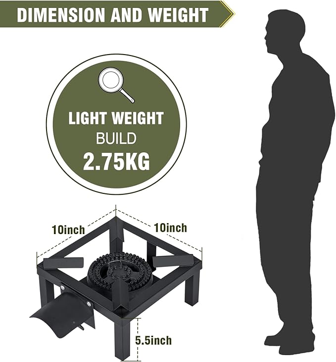 - Premium Quality Material: Portable propane burners for outdoor cooking, made of cast iron for durability. Our outdoor propane burner comes with a top heat shield that prevents oil spills and prevents flames from burning into the hose connections, and a bottom heat shield designed to protect parts and surfaces from heat damage and enhance thermal protection