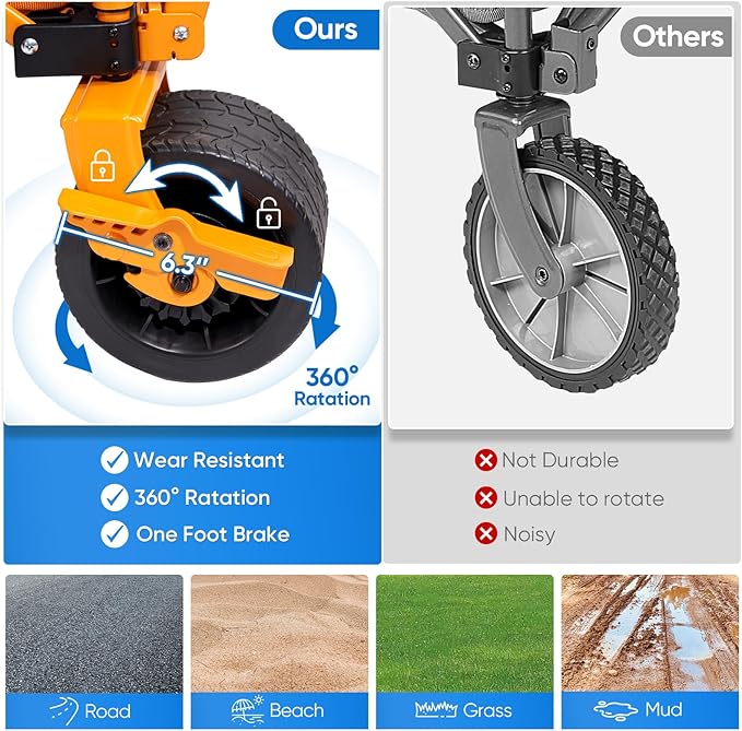 - Safety First: Equipped with front-wheel brakes for added safety, our beach cart also features all-terrain PVC wheels that are hard-wearing, abrasion-resistant, quiet and shock-absorbing. No matter where you go, this wagon can handle it all!