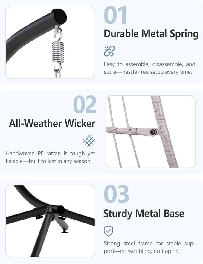 - Heavy-Duty & Rust-Resistant Build: Made with a powder-coated steel frame and hand-woven all-weather wicker, our hanging egg chair supports 350 lbs and resists rust, fading, and wear better than most outdoor egg chairs