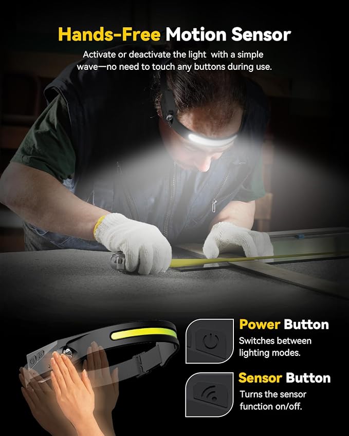 - HANDS-FREE OPERATION WITH MOTION SENSOR: Easily activate this head flashlight for adults using the smart motion sensor, providing true hands-free convenience for various tasks. Whether you're adjusting light settings while working, exercising, or in an emergency, this feature ensures quick and seamless control without touching the headband light.