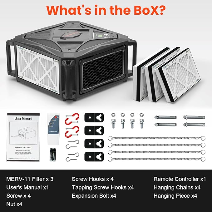 - Smart Control & Easy Installation:The dust collector system offers dual operation modes with both touch panel and remote control (26ft range) for convenient adjustments. Free hanging chains and nails allow for quick ceiling or wall mounting, making it ideal for various workspace configurations.
