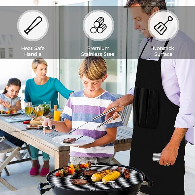 - COMPLETE GRILLING ACCESSORIES: Our 32-Piece BBQ Tool Set includes essential grill accessories like apron, tongs, basting brush, 4-in-1 spatula, cleaning brush, fork, knife, meat thermometer, heat-resistant gloves, bottle opener, salt and pepper shakers, meat claws, corn holders, and skewers—all neatly packed in a handy carrying case, ensuring you're fully equipped for backyard barbecues or camping trips