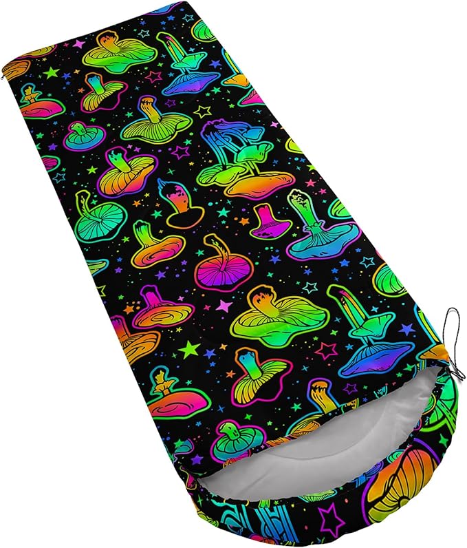 - Unique Mushroom Design:This Mushroom pattern sleeping bag is made of 3D digital printing with vibrant colors and patterns,size: 31W x 90L inches,temperature range: 32℉-77℉ (0℃-25℃),it also also have a weather resistant waterproof design to keep you warm and prevent you from any dampness,can be used in 3 seasons