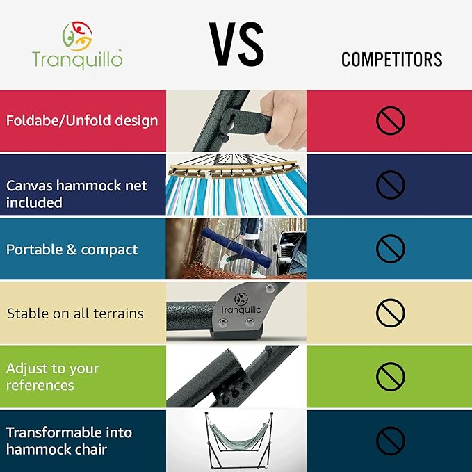 - PATENTED INNOVATIVE DESIGN: Proudly patented for its smart, tool- free setup in just 30 seconds, the Tranquillo Hammock with stand offers effortless outdoor relaxation. Easily adjustable for perfect comfort, built with durable materials for long-lasting use
