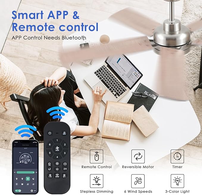 - - Remote & App Control: The remote control comes with almost all the features you need, including 6-speed wind, reverse or forword rotation, 3-color temperature and stepless dimming. You can also scan the QR code on the manual, download and pair the APP, then control the fan light with your phone. Easily adapted to any scene needs, it is an ideal replacement for traditional fans or chandeliers.