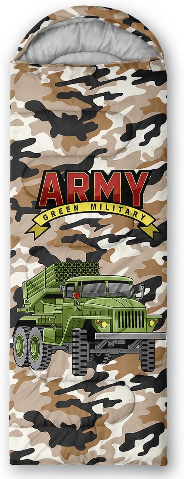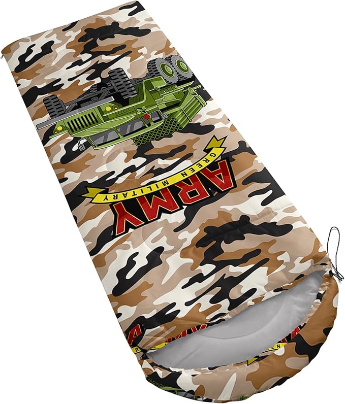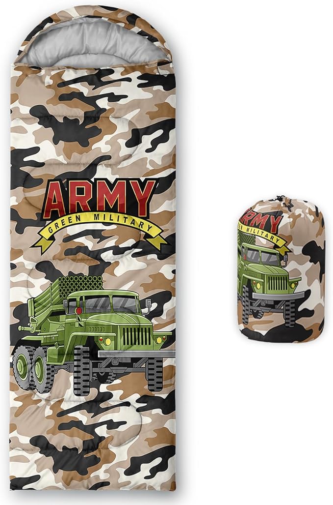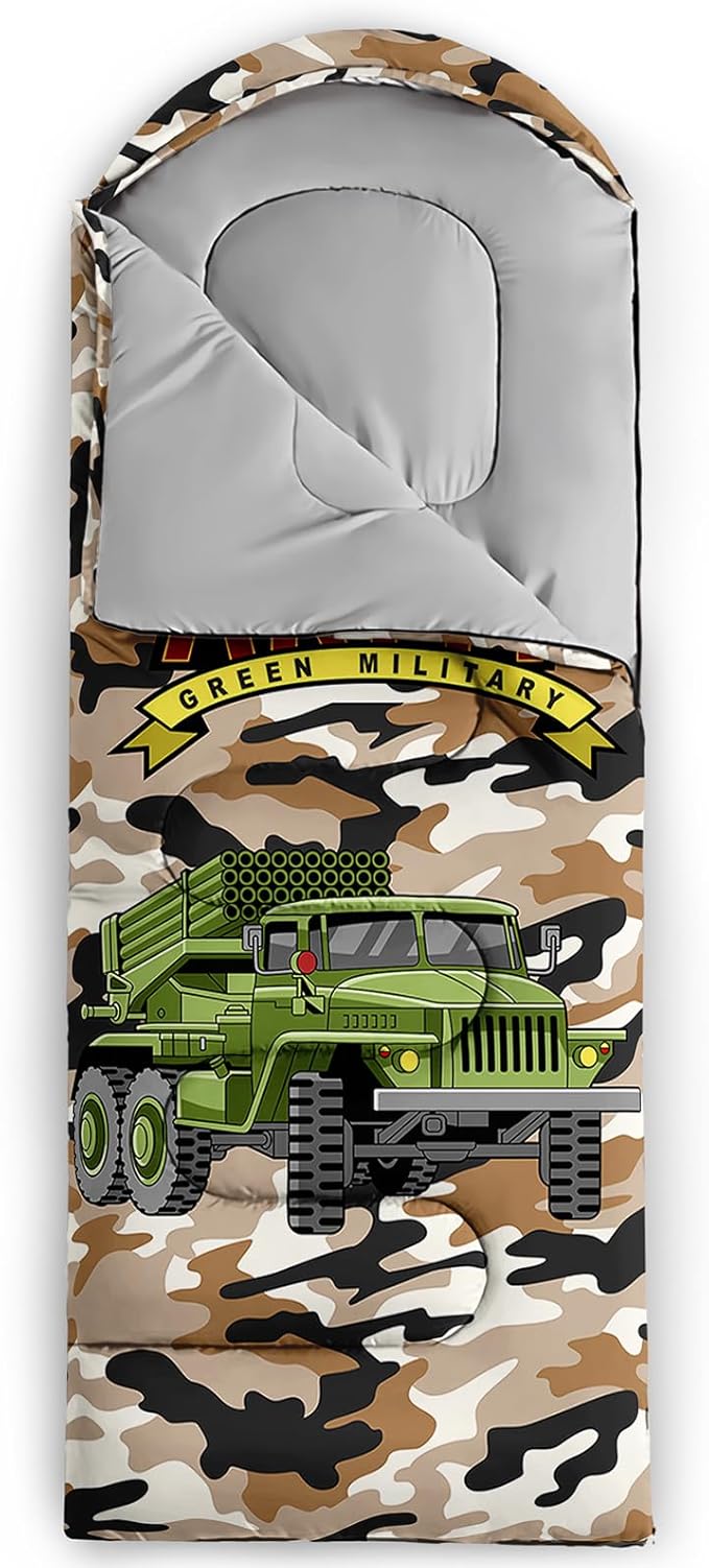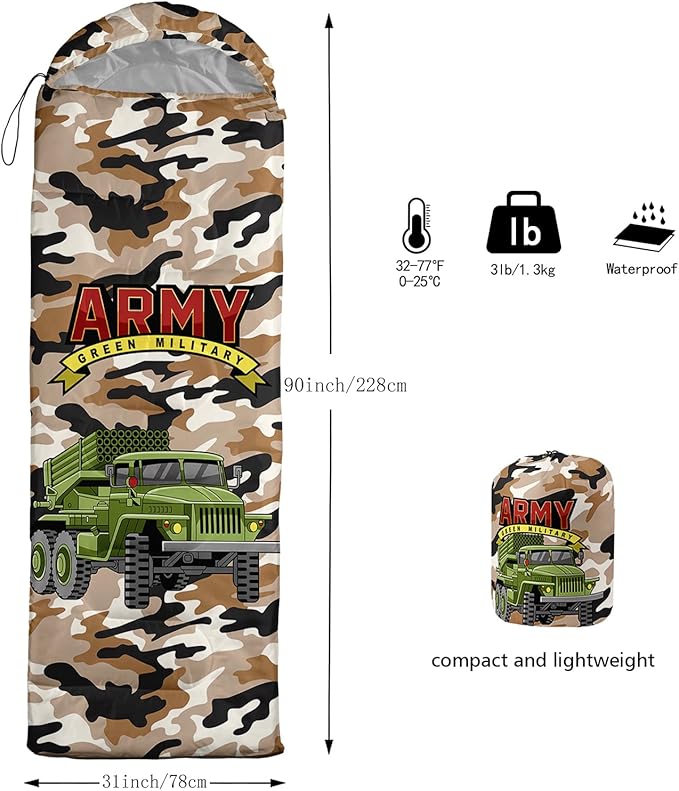 - Unique Truck Design:This Truck pattern sleeping bag is made of 3D digital printing with vibrant colors and patterns,size: 31W x 90L inches,temperature range: 32℉-77℉ (0℃-25℃),it also also have a weather resistant waterproof design to keep you warm and prevent you from any dampness,can be used in 3 seasons