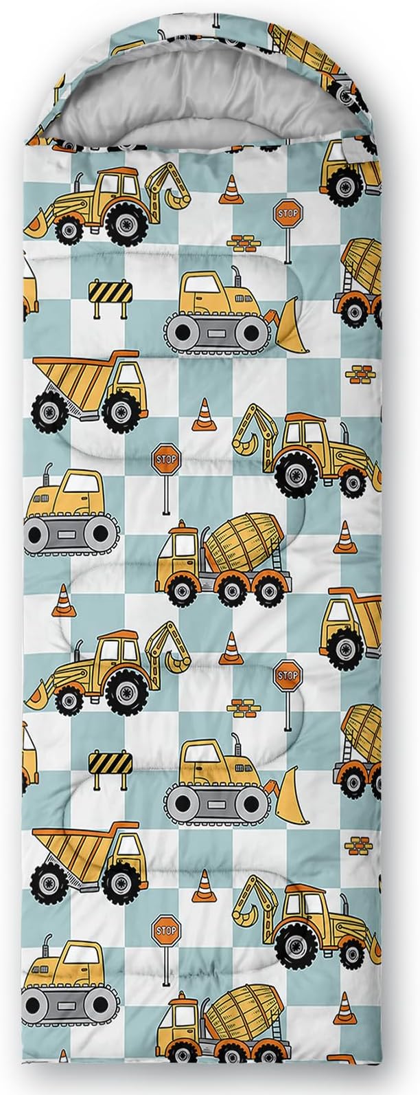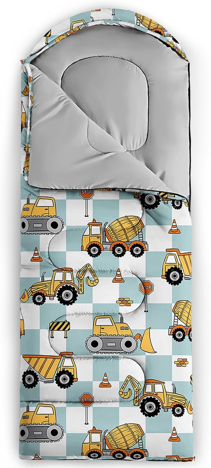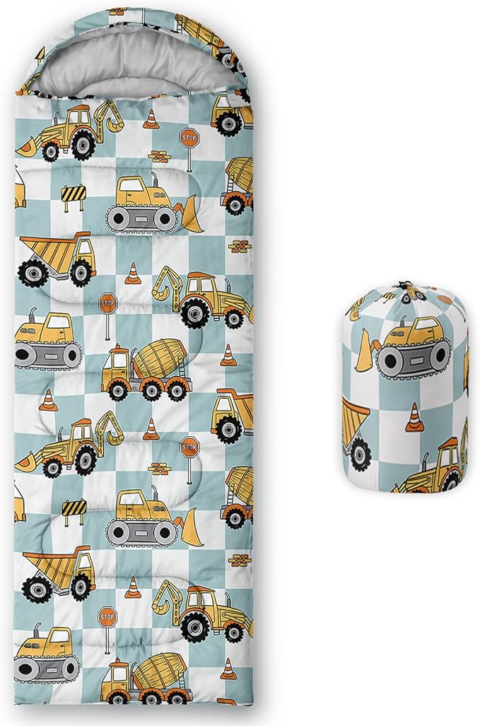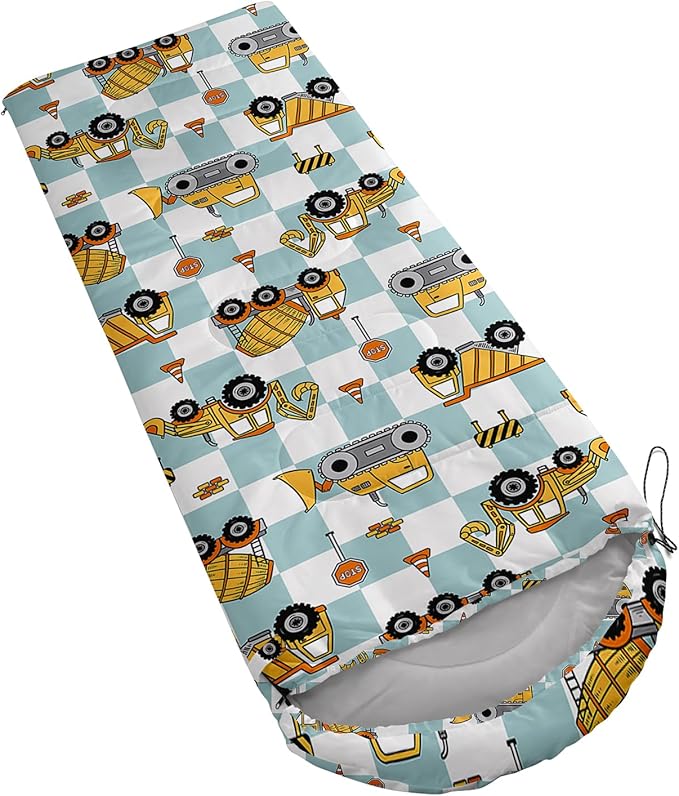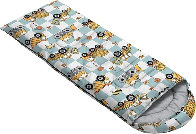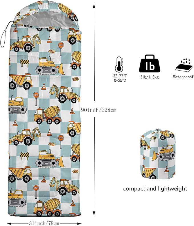 - Unique Excavator Design:This Excavator pattern sleeping bag is made of 3D digital printing with vibrant colors and patterns,size: 31W x 90L inches,temperature range: 32℉-77℉ (0℃-25℃),it also also have a weather resistant waterproof design to keep you warm and prevent you from any dampness,can be used in 3 seasons