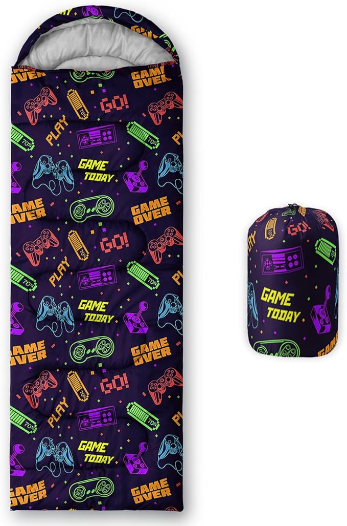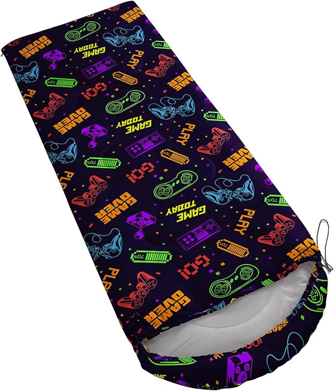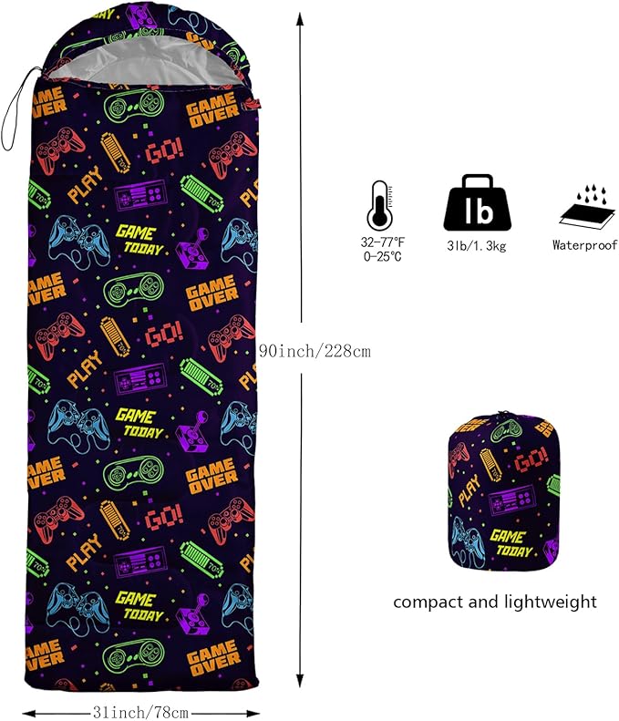 - Unique Game Design:This Game pattern sleeping bag is made of 3D digital printing with vibrant colors and patterns,size: 31W x 90L inches,temperature range: 32℉-77℉ (0℃-25℃),it also also have a weather resistant waterproof design to keep you warm and prevent you from any dampness,can be used in 3 seasons