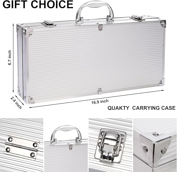 - 【ALUMINUM STORAGE CASE】Our grill accessories come neatly packaged in a sleek silver aluminum case that keeping your barbecue tools organized and protected,ready for your backyard barbecue party.BBQ accessories packaged in aluminum boxes are excellent gifts for fathers,spouses,brothers,and friends on occasions such as Christmas,Father's Day,birthdays,or anniversaries.