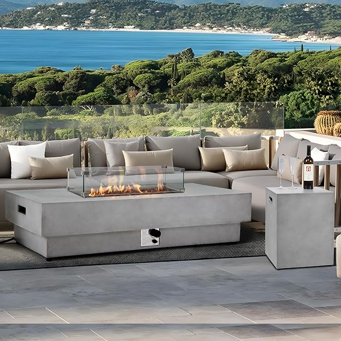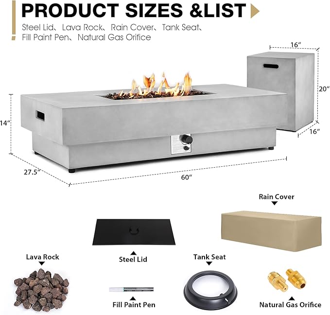 - 【60" Outdoor Fire Pit】Our 60 inch outdoor propane firepit coffee table 3-piece 50,000 BTU concrete large rectangular fire table tank cover. The heat output is providing ample warmth and creating a romantic bonfire atmosphere very popular!