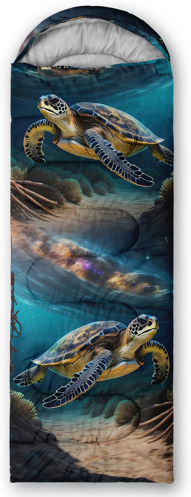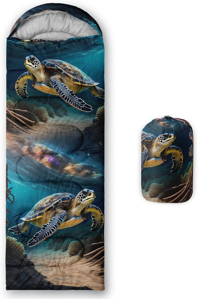 - Unique Sea Turtle Design:This Sea Turtle pattern sleeping bag is made of 3D digital printing with vibrant colors and patterns,size: 31W x 90L inches,temperature range: 32℉-77℉ (0℃-25℃),it also also have a weather resistant waterproof design to keep you warm and prevent you from any dampness,can be used in 3 seasons