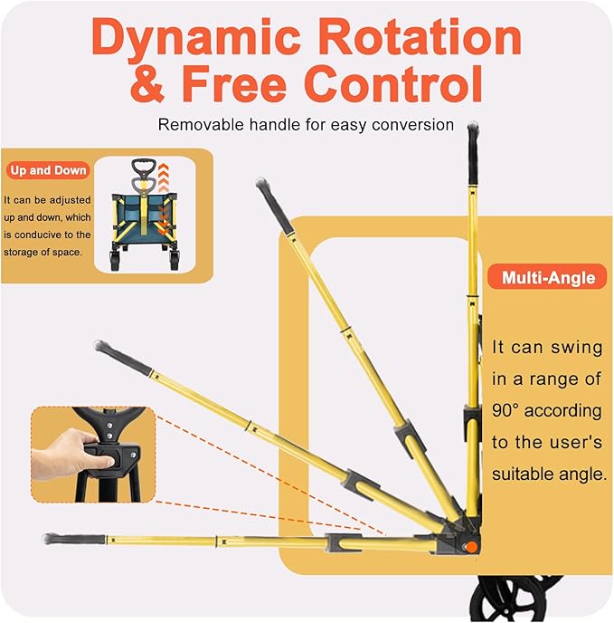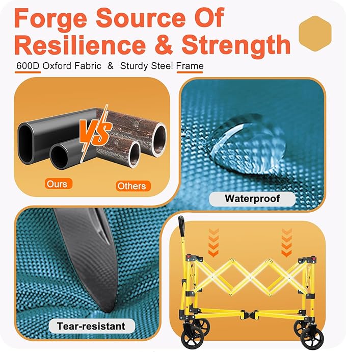 - RUGGED AND DURABLE FOLDBLE WAGON: CUMNTQ wagon's frame is a nice thick, strong steel alloy frame that can hold 230lbs. The handle is made from the same sturdy material as the frame, and it telescopes out and can be collapsed by pressing a button and a push-slot. The handle is nice and long, so there's no worry about the wagon bumping you ankles (ouch!) or running over your shoe and giving you a "flat tire"