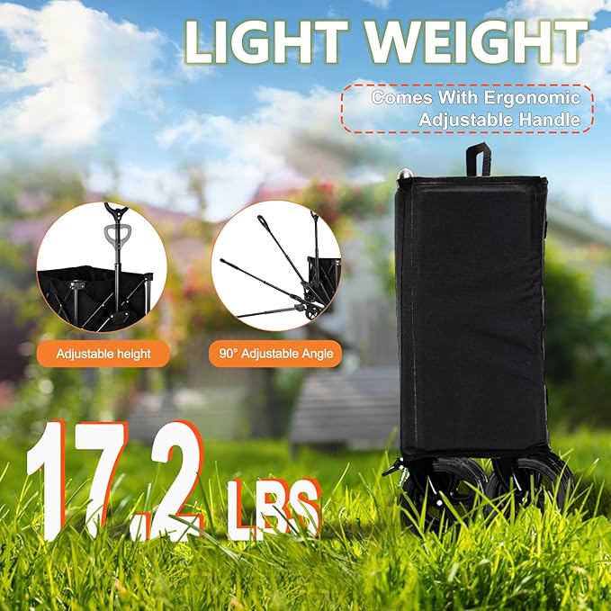 - ULTRA CPMPACT-FOLDING WAGON CART WITH WHEELS: With the ability to stretch like Spider-Man, this is our upgraded four-way folding station wagon for you. Just 17.20 pounds, it weighs less than your weekend shopping bag - and is easy to lift with one finger! Our beach wagon! Just pull the middle strap and watch it collapse in a second
