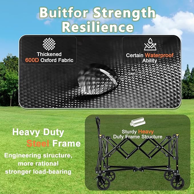 - RUGGED AND DURABLE-GROCERY CART ON WHEELS: Built with a thick strong alloy steel frame, Our wagon cart is as reliable as Iron Man, wear-resistant and resistant to rust, and will keep you company for longer. The collapsible wagon with wheels also comes with a 600D Oxford cloth clothing pocket - waterproof, tear resistant and easy to clean when removed