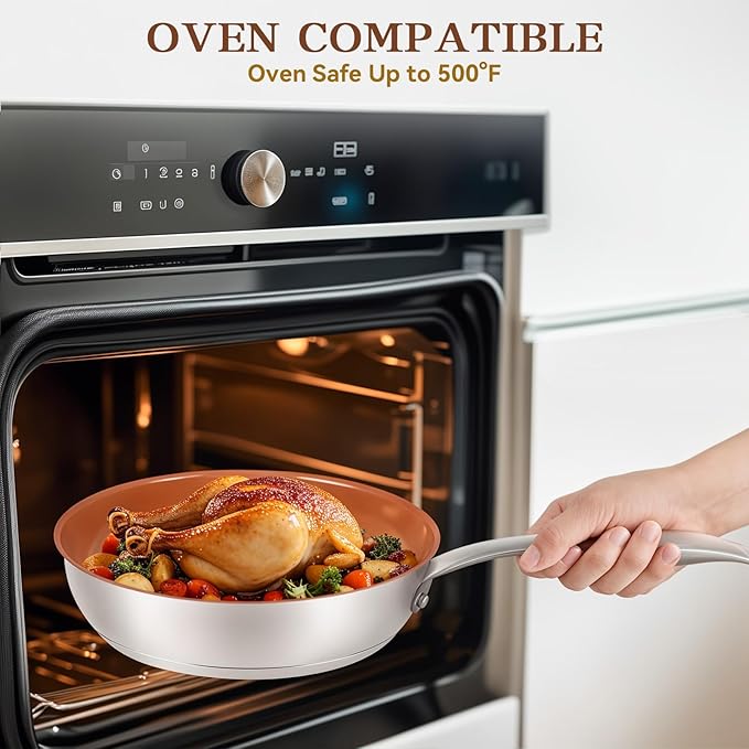 - OVEN COMPATIBLE: Ceramic skillet is oven-compatible up to 500°F, moving easily from stovetop to oven and handling high heat without warping, making it a versatile addition to your kitchen