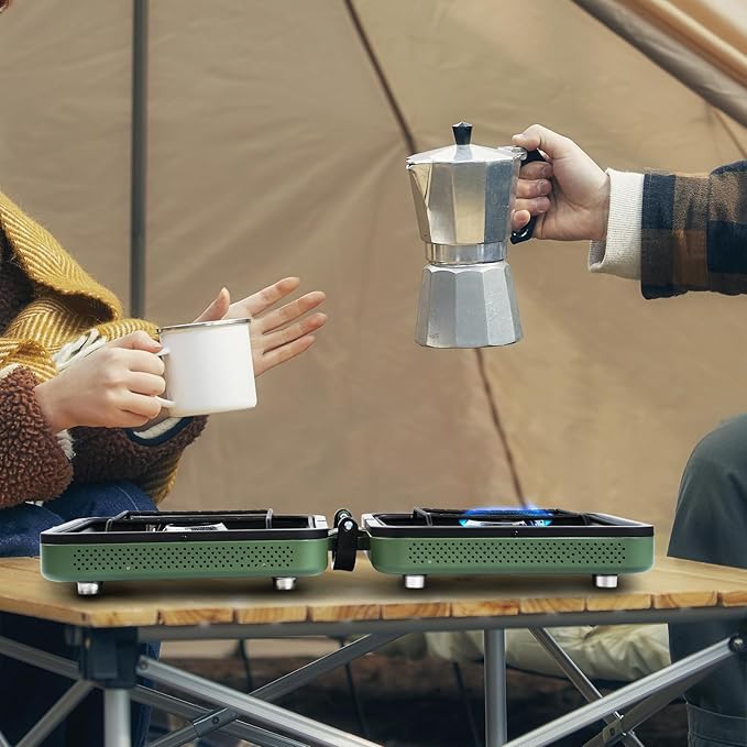 - 【High-Powered Dual Burner Stove】Dual Burner Camping Stove with a powerful 17,200 BTU output, this propane camping stove delivers strong heat, quickly cooking food and improving efficiency. The button-activated piezo ignition system makes it easy to light the burners, providing quick and reliable ignition. Portable camping stove's high power makes it ideal for outdoor camping and winter conditions, effortlessly handling various cooking tasks, ensuring your outdoor cooking is both efficient and convenient.