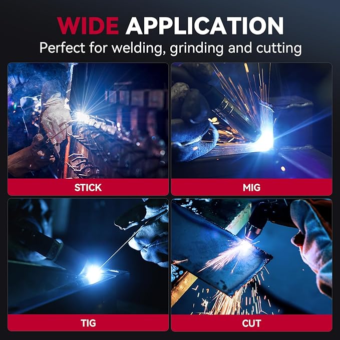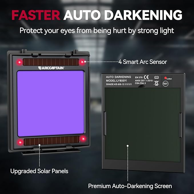- FASTER AUTO DARKENING: Upgrade to high-end auto-darkening lenses with 4 premium arc sensors, switching from light to dark in 1/25000 sec. Easily adjust the shade and sensitivity of the lenses for different working environments, perfect for STICK/MIG/TIG welding, grinding, and cutting. Dark state level: 4/5-8/9-13.