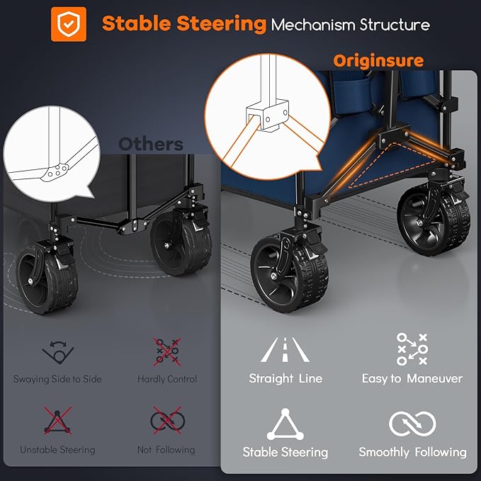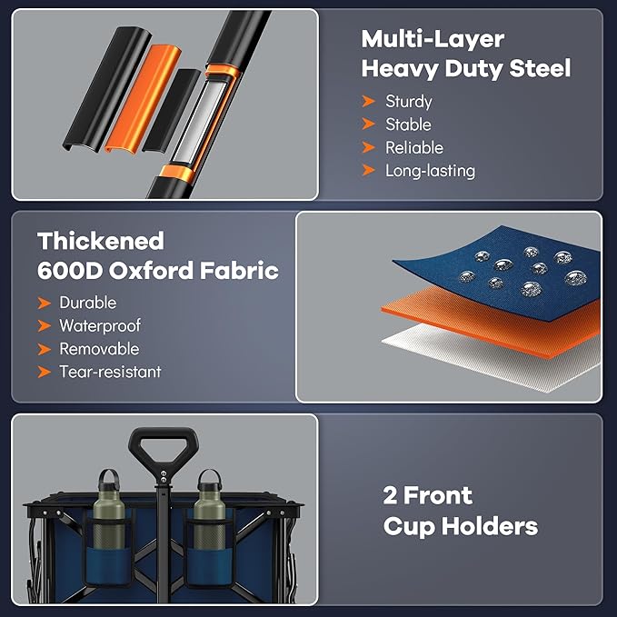 - ใ๐ฐ๐ฒ๐ฌ๐๐ ๐ช๐ฒ๐ถ๐ด๐ต๐ ๐๐ฎ๐ฝ๐ฎ๐ฐ๐ถ๐๐ ๐๐ฒ๐ฎ๐๐ ๐๐๐๐ ๐จ๐๐ถ๐น๐ถ๐๐ ๐ช๐ฎ๐ด๐ผ๐ป ๐๐ฎ๐ฟ๐๐ ๐๐ถ๐๐ต ๐ฆ๐๐๐ฟ๐ฑ๐ ๐๐ถ๐ด๐ต-๐๐๐ฟ๐ฒ๐ป๐ด๐๐ต ๐๐น๐น-๐บ๐ฒ๐๐ฎ๐น ๐๐ฟ๐ฎ๐บ๐ฒใOur outdoor collapsible cart is made of solid mental frame, 20% thicker than other carts. Featuring innovative structural design, static load capacity up to 460lb and dynamic load capacity up to 330lb, ideal for grocery, shopping, camping, garden, sports, travel. With double-layer thickened durable 600D Oxford fabric, waterproof, wear-resistant and tear-resistant, ensuring stable support for all your gear.