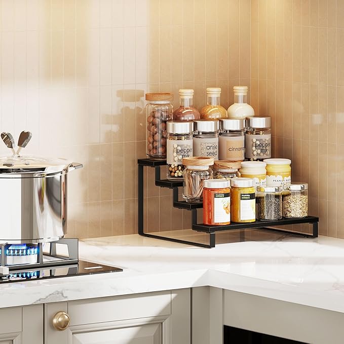 - Easy Access and Visibility: The tiered spice rack design allows for easy access and clear visibility of all your spices, so you can quickly find what you need while cooking. Say goodbye to rummaging through drawers and cupboards