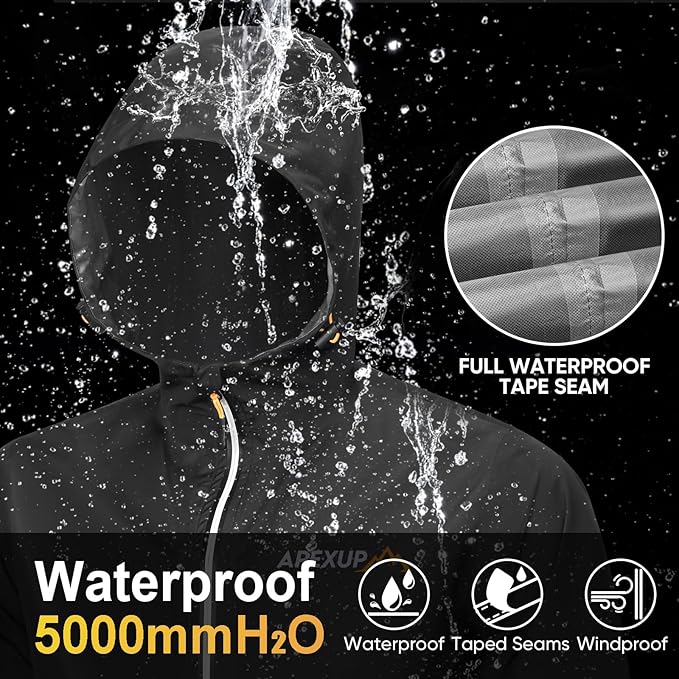 • Waterproof and Windproof: APEXUP men's rain jacket is made from tear-resistant, high-density polyester with waterproof zippers; It features a premium waterproof coating and hot-pressing sealed seams, ensuring a 5000-8000mm waterproof rating to keep you dry in any weather